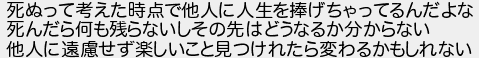 死ぬって考えた時点で他人に人生を捧げちゃってるんだよな 死んだら何も残らないしその先はどうなるか分からない 他人に遠慮せず楽しいこと見つけれたら変わるかもしれない