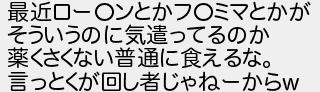 417: [] 2007/10/19(金) 19:30:27 最近ロー○ンとかフ○ミマとかが そういうのに気遣ってるのか 薬くさくない普通に食えるな。 言っとくが回し者じゃねーからw http://kizuna.5ch.net/test/read.cgi/recipe/1162040407/417