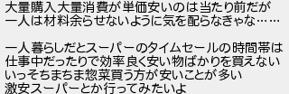 大量購入大量消費が単価安いのは当たり前だが 一人は材料余らせないように気を配らなきゃな 一人暮らしだとスーパーのタイムセールの時間帯は 仕事中だったりで効率良く安い物ばかりを買えない いっそちまちま惣菜買う方が安いことが多い 激安スーパーとか行ってみたいよ