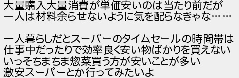 大量購入大量消費が単価安いのは当たり前だが 一人は材料余らせないように気を配らなきゃな 一人暮らしだとスーパーのタイムセールの時間帯は 仕事中だったりで効率良く安い物ばかりを買えない いっそちまちま惣菜買う方が安いことが多い 激安スーパーとか行ってみたいよ