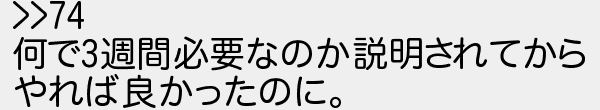 75: [] 2018/08/19(日) 17:30:47.12 ID:6vQSQyMG >>74 何で3週間必要なのか説明されてから やれば良かったのに。 http://egg.5ch.net/test/read.cgi/regulate/1496112430/75