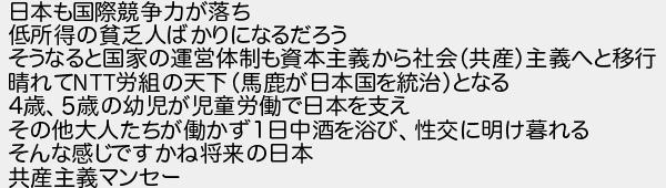 日本も国際競争力が落ち 低所得の貧乏人ばかりになるだろう そうなると国家の運営体制も資本主義から社会共産主義へと移行 晴れて労組の天下馬鹿が日本国を統治となる 4歳5歳の幼児が児童労働で日本を支え その他大人たちが働かず1日中酒を浴び性交に明け暮れる そんな感じですかね将来の日本 共産主義マンセー