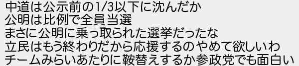 中道は公示前の以下に沈んだか 公明は比例で全員当選 まさに公明に乗っ取られた選挙だったな 立民はもう終わりだから応援するのやめて欲しいわ チームみらいあたりに鞍替えするか参政党でも面白い