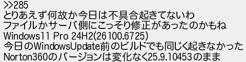 286: [] 2025/09/30(火) 21:01:47.20 >>285 とりあえず何故か今日は不具合起きてないわ ファイルかサーバ側にこっそり修正があったのかもね Windows11 Pro 24H2(26100.6725) 今日のWindowsUpdate前のビルドでも同じく起きなかった Norton360のバージョンは変化なく25.9.10453のまま http://medaka.5ch.net/test/read.cgi/sec/1753629254/286