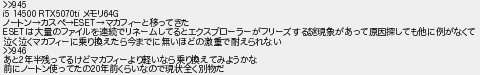 948: [] 2026/01/27(火) 07:51:02.06 >>945 i5 14500 RTX5070ti メモリ64G ノートン→カスペ→ESET→マカフィーと移ってきた ESETは大量のファイルを連続でリネームしてるとエクスプローラーがフリーズする謎現象があって原因探しても他に例がなくて 泣く泣くマカフィーに乗り換えたら今までに無いほどの激重で耐えられない >>946 あと2年半残ってるけどマカフィーより軽いなら乗り換えてみようかな 前にノートン使ってたの20年前くらいなので現状全く別物だ http://medaka.5ch.net/test/read.cgi/sec/1753629254/948