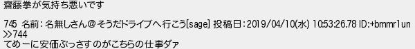670: [sage] 2019/04/10(水) 10:58:53.53 ID:Hs9pUqlr0 齋藤拳が気持ち悪いです 745 名前:名無しさん@そうだドライブへ行こう[sage] 投稿日:2019/04/10(水) 10:53:26.78 ID:+bmmr1un >>744 てめーに安価ぶっさすのがこちらの仕事ダァ http://agree.5ch.net/test/read.cgi/sec2chd/1553772638/670