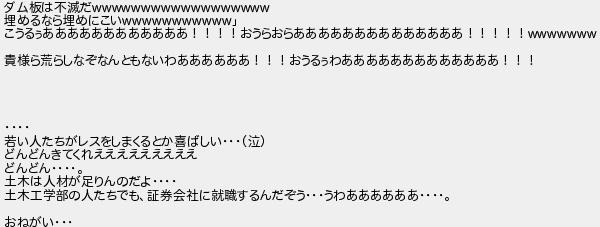 ダム板は不滅だ 埋めるなら埋めにこい こうるぅああああああああああああ!!!!おうらおらああああああああああああああ!!!!! 貴様ら荒らしなぞなんともないわああああああ!!!おうるぅわあああああああああああああ!!! 若い人たちがレスをしまくるとか喜ばしい泣 どんどんきてくれえええええええええ どんどん 土木は人材が足りんのだよ 土木工学部の人たちでも証券会社に就職するんだぞううわああああああ おねがい