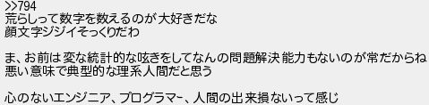 荒らしって数字を数えるのが大好きだな 顔文字ジジイそっくりだわ まお前は変な統計的なきをしてなんの問題解決能力もないのが常だからね 悪い意味で典型的な理系人間だと思う 心のないエンジニアプログラマ人間の出来損ないって感じ