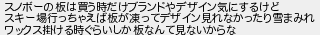 スノボーの板は買う時だけブランドやデザイン気にするけど スキー場行っちゃえば板が凍ってデザイン見れなかったり雪まみれ ワックス掛ける時ぐらいしか板なんて見ないからな