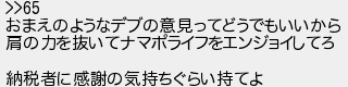 おまえのようなデブの意見ってどうでもいいから 肩の力を抜いてナマポライフをエンジョイしてろ 納税者に感謝の気持ちぐらい持てよ