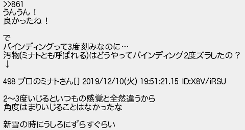 うんうん! 良かったね! で バインディングって度刻みなのに 汚物ミナトとも呼ばれるはどうやってバインディング度ズラしたの? プロのミナトさん 火 度いじるといつもの感覚と全然違うから 角度はまりいじることはなかったな 新雪の時にうしろにずらすぐらい