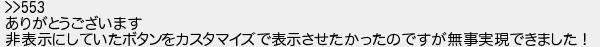 554: [sage] 2017/01/13(金) 09:09:21.38 ID:MCXhBEh+0 >>553 ありがとうございます 非表示にしていたボタンをカスタマイズで表示させたかったのですが無事実現できました! http://egg.5ch.net/test/read.cgi/software/1438959541/554