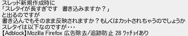 632: [sage] 2019/07/03(水) 22:30:49.28 ID:zjfM8+lY0 スレッド新規作成時に 「スレタイが長すぎです 書き込みますか?」 と出るのですが 書き込んでもそのまま反映されますか?もしくはカットされちゃうのでしょうか スレタイは以下なのですが・・・ 【Adblock】Mozilla Firefox 広告除去/追跡防止 28 ワッチョイあり http://egg.5ch.net/test/read.cgi/software/1551951740/632