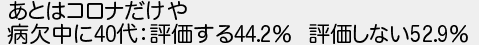 74: [sage] 2024/04/14(日) 23:54:53.11 ID:46yCoX910 あとはコロナだけや 病欠中に40代:評価する44.2% 評価しない52.9% http://egg.5ch.net/test/read.cgi/software/1712375061/74