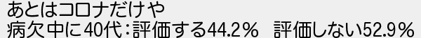 74: [sage] 2024/04/14(日) 23:54:53.11 ID:46yCoX910 あとはコロナだけや 病欠中に40代:評価する44.2% 評価しない52.9% http://egg.5ch.net/test/read.cgi/software/1712375061/74