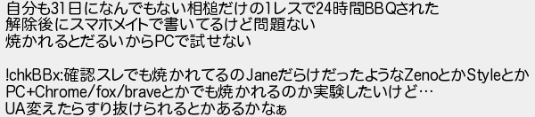 52: 警備員[Lv.6][新芽] [] 2025/01/01(水) 10:04:25.27 ID:29JplZAl0 自分も31日になんでもない相槌だけの1レスで24時間BBQされた 解除後にスマホメイトで書いてるけど問題ない 焼かれるとだるいからPCで試せない !chkBBx:確認スレでも焼かれてるのJaneだらけだったようなZenoとかStyleとか PC+Chrome/fox/braveとかでも焼かれるのか実験したいけど… UA変えたらすり抜けられるとかあるかなぁ http://egg.5ch.net/test/read.cgi/software/1734831742/52