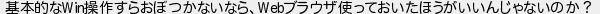 221: 警備員[Lv.0][新芽] [sage] 2025/06/12(木) 00:24:20.46 ID:7sK6+SdZ0 基本的なWin操作すらおぼつかないなら、Webブラウザ使っておいたほうがいいんじゃないのか? http://egg.5ch.net/test/read.cgi/software/1748441663/221