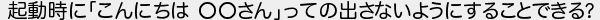 116: (アウアウウーT Saa7-yPbB) [sage] 2025/12/21(日) 23:12:46.92 ID:Q57i1erfa 起動時に「こんにちは ○○さん」っての出さないようにすることできる? http://egg.5ch.io/test/read.cgi/software/1763288321/116