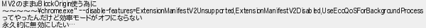 243: (ワッチョイ a9b1-8oQz) [sage] 2026/01/26(月) 15:12:16.33 ID:woIJ4fll0 MV2のままuBlockOrigin使う為に ~~~~~\chrome.exe" --disable-features=ExtensionManifestV2Unsupported,ExtensionManifestV2Disabled,UseEcoQoSForBackgroundProcess ってやったんだけど効率モードがオフにならない 永久的に無効にしたい… http://egg.5ch.net/test/read.cgi/software/1763288321/243