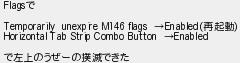 653: (ワッチョイW 1664-byzt) [sage] 2026/04/08(水) 08:37:22.60 ID:s96H/AdW0 Flagsで Temporarily unexpire M146 flags →Enabled(再起動) Horizontal Tab Strip Combo Button →Enabled で左上のうぜーの撲滅できた http://egg.5ch.io/test/read.cgi/software/1763288321/653