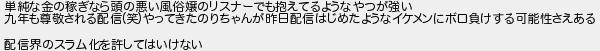 単純な金の稼ぎなら頭の悪い風俗嬢のリスナーでも抱えてるようなやつが強い 九年も尊敬される配信笑やってきたのりちゃんが昨日配信はじめたようなイケメンにボロ負けする可能性さえある 配信界のスラム化を許してはいけない