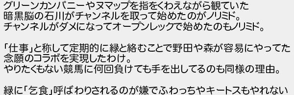 グリーンカンパニーやヌマップを指をくわえながら観ていた 暗黒脳の石川がチャンネルを取って始めたのがノリミド チャンネルがダメになってオープンレックで始めたのもノリミド 仕事と称して定期的に緑と絡むことで野田や森が容易にやってた 念願のコラボを実現したわけ やりたくもない競馬に何回負けても手を出してるのも同様の理由 緑に乞食呼ばわりされるのが嫌でふわっちやキートスもやれない
