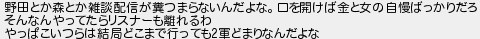 野田とか森とか雑談配信が糞つまらないんだよな口を開けば金と女の自慢ばっかりだろ そんなんやってたらリスナーも離れるわ やっぱこいつらは結局どこまで行っても軍どまりなんだよな