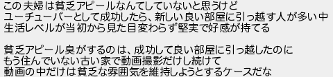 この夫婦は貧乏アピールなんてしていないと思うけど ユーチューバーとして成功したら新しい良い部屋に引っ越す人が多い中 生活レベルが当初から見た目変わらず堅実で好感が持てる 貧乏アピール臭がするのは成功して良い部屋に引っ越したのに もう住んでいない古い家で動画撮影だけし続けて 動画の中だけは貧乏な雰囲気を維持しようとするケースだな