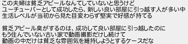 この夫婦は貧乏アピールなんてしていないと思うけど ユーチューバーとして成功したら新しい良い部屋に引っ越す人が多い中 生活レベルが当初から見た目変わらず堅実で好感が持てる 貧乏アピール臭がするのは成功して良い部屋に引っ越したのに もう住んでいない古い家で動画撮影だけし続けて 動画の中だけは貧乏な雰囲気を維持しようとするケースだな