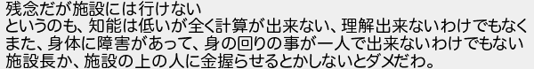 残念だが施設には行けない というのも知能は低いが全く計算が出来ない理解出来ないわけでもなく また身体に障害があって身の回りの事が一人で出来ないわけでもない 施設長か施設の上の人に金握らせるとかしないとダメだわ