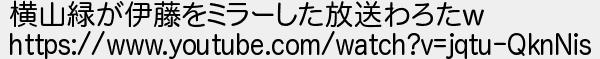307: 名無しさん@お腹いっぱい。 [sage] 2020/01/01(水) 22:25:59.84 横山緑が伊藤をミラーした放送わろたw https://www.youtube.com/watch?v=jqtu-QknNis http://egg.5ch.io/test/read.cgi/streaming/1577809021/307