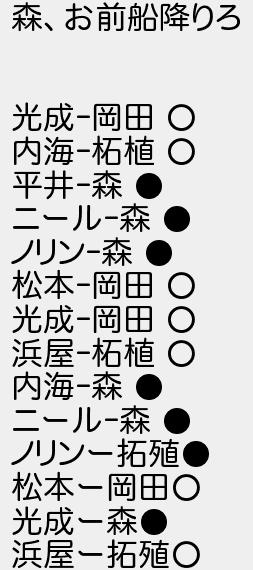 森お前船降りろ 光成岡田 内海柘植 平井森 ニール森 ノリン森 松本岡田 光成岡田 浜屋柘植 内海森 ニール森 ノリンー拓殖 松本ー岡田 光成ー森 浜屋ー拓殖