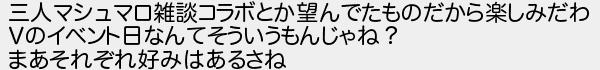 三人マシュマロ雑談コラボとか望んでたものだから楽しみだわ のイベント日なんてそういうもんじゃね? まあそれぞれ好みはあるさね