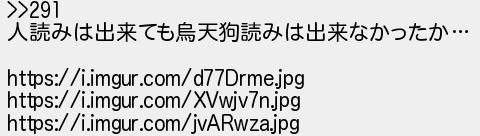 341: [sage] 2021/02/10(水) 15:22:41 >>291 人読みは出来ても烏天狗読みは出来なかったか… https://i.imgur.com/d77Drme.jpg https://i.imgur.com/XVwjv7n.jpg https://i.imgur.com/jvARwza.jpg http://egg.5ch.net/test/read.cgi/streaming/1612928621/341
