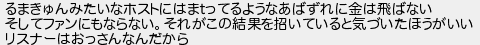 るまきゅんみたいなホストにはまってるようなあばずれに金は飛ばない そしてファンにもならないそれがこの結果を招いていると気づいたほうがいい リスナーはおっさんなんだから