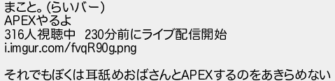 273: [sage] 2021/05/01(土) 14:56:07.90 まこと。(らいバー) APEXやるよ 316人視聴中 230分前にライブ配信開始 i.imgur.com/fvqR90g.png それでもぼくは耳舐めおばさんとAPEXするのをあきらめない http://egg.5ch.io/test/read.cgi/streaming/1619708459/273