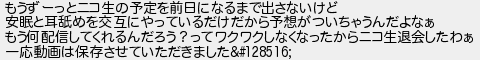 もうずーっとニコ生の予定を前日になるまで出さないけど 安眠と耳めを交互にやっているだけだから予想がついちゃうんだよなぁ もう何配信してくれるんだろう?ってワクワクしなくなったからニコ生退会したわぁ 一応動画は保存させていただきました