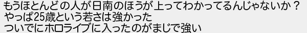 もうほとんどの人が日南のほうが上ってわかってるんじゃないか? やっぱ歳という若さは強かった ついでにホロライブに入ったのがまじで強い