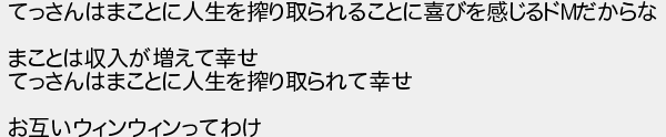 てっさんはまことに人生を搾り取られることに喜びを感じるドだからな まことは収入が増えて幸せ てっさんはまことに人生を搾り取られて幸せ お互いウィンウィンってわけ