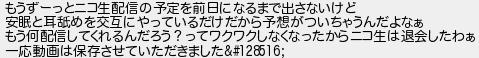 もうずーっとニコ生配信の予定を前日になるまで出さないけど 安眠と耳めを交互にやっているだけだから予想がついちゃうんだよなぁ もう何配信してくれるんだろう?ってワクワクしなくなったからニコ生は退会したわぁ 一応動画は保存させていただきました