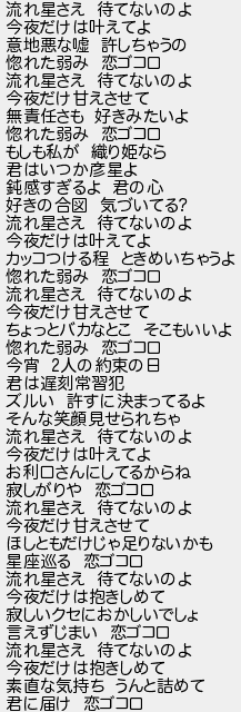 646: [sage] 2021/05/04(火) 12:04:56.31 流れ星さえ 待てないのよ 今夜だけは叶えてよ 意地悪な嘘 許しちゃうの 惚れた弱み 恋ゴコロ 流れ星さえ 待てないのよ 今夜だけ甘えさせて 無責任さも 好きみたいよ 惚れた弱み 恋ゴコロ もしも私が 織り姫なら 君はいつか彦星よ 鈍感すぎるよ 君の心 好きの合図 気づいてる? 流れ星さえ 待てないのよ 今夜だけは叶えてよ カッコつける程 ときめいちゃうよ 惚れた弱み 恋ゴコロ 流れ星さえ 待てないのよ 今夜だけ甘えさせて ちょっとバカなとこ そこもいいよ 惚れた弱み 恋ゴコロ 今宵 2人の約束の日 君は遅刻常習犯 ズルい 許すに決まってるよ そんな笑顔見せられちゃ 流れ星さえ 待てないのよ 今夜だけは叶えてよ お利口さんにしてるからね 寂しがりや 恋ゴコロ 流れ星さえ 待てないのよ 今夜だけ甘えさせて ほしともだけじゃ足りないかも 星座巡る 恋ゴコロ 流れ星さえ 待てないのよ 今夜だけは抱きしめて 寂しいクセにおかしいでしょ 言えずじまい 恋ゴコロ 流れ星さえ 待てないのよ 今夜だけは抱きしめて 素直な気持ち うんと詰めて 君に届け 恋ゴコロ http://egg.5ch.io/test/read.cgi/streaming/1619708459/646