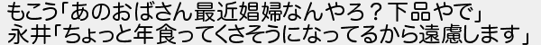 もこうあのおばさん最近娼婦なんやろ?下品やで 永井ちょっと年食ってくさそうになってるから遠慮します