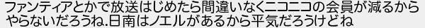 ファンティアとかで放送はじめたら間違いなくニコニコの会員が減るから やらないだろうね日南はノエルがあるから平気だろうけどね