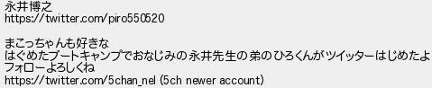 787: [] 2021/05/05(水) 23:56:02.95 永井博之 https://twitter.com/piro550520 まこっちゃんも好きな はぐめたブートキャンプでおなじみの永井先生の弟のひろくんがツイッターはじめたよ フォローよろしくね https://twitter.com/5chan_nel (5ch newer account) http://egg.5ch.io/test/read.cgi/streaming/1619708459/787
