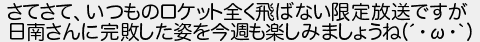 さてさていつものロケット全く飛ばない限定放送ですが 日南さんに完敗した姿を今週も楽しみましょうね