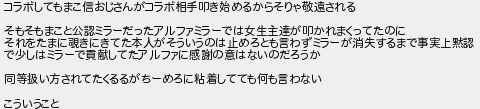 コラボしてもまこ信おじさんがコラボ相手叩き始めるからそりゃ敬遠される そもそもまこと公認ミラーだったアルファミラーでは女生主達が叩かれまくってたのに それをたまに覗きにきてた本人がそういうのは止めろとも言わずミラーが消失するまで事実上黙認 で少しはミラーで貢献してたアルファに感謝の意はないのだろうか 同等扱い方されてたくるるがちーめろに粘着してても何も言わない こういうこと