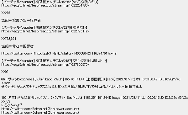 653: [age] 2021/08/15(日) 00:11:45 【バーチャルYoutuber】楠栞桜アンチスレ#2262【VS花京院ちえり】 https://egg.5ch.net/test/read.cgi/streaming/1622284780/ >>215 塩餡=殺害予告=犯罪者 【バーチャルYoutuber】楠栞桜アンチスレ#2279【勝者なし】 https://egg.5ch.net/test/read.cgi/streaming/1622725112/ >>713,751 塩餡=脅迫=犯罪者 https://twitter.com/RHxbgt2zN3rN2No/status/1400380421116874764?s=19 【バーチャルYoutuber】楠栞桜アンチスレ#2487【マザボ交換しました…】 https://egg.5ch.net/test/read.cgi/streaming/1627860570/ >>96 661 ヴぃうちid:ignore (ワッチョイ babc-xWuh [165.76.171.44 [上級国民]]) [sage] 2021/07/15(木) 10:53:06.49 ID:J16VQY/40 >>656 そりゃ推しがとんでもないクズだったと知ったら脳が破壊されてもしょうがないよな…同情するよ 190 名無しさん@お腹いっぱい。 (アウアウキー Sacf-LuUr [182.251.191.244]) [sage] 2021/08/14(土) 06:03:13.30 ID:NC2qM6NGa >>189 いらりんちょ? https://twitter.com/5chan_nel (5ch newer account) https://twitter.com/5chan_nel (5ch newer account) http://egg.5ch.net/test/read.cgi/streaming/1628945938/653