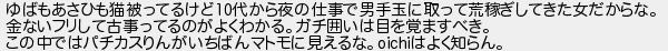 ゆばもあさひも猫被ってるけど代から夜の仕事で男手玉に取って荒稼ぎしてきた女だからな 金ないフリして古事ってるのがよくわかるガチ囲いは目を覚ますべき この中ではパチカスりんがいちばんマトモに見えるなはよく知らん