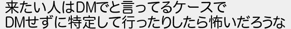 362: [sage] 2021/11/05(金) 09:49:28 来たい人はDMでと言ってるケースで DMせずに特定して行ったりしたら怖いだろうな http://egg.5ch.net/test/read.cgi/streaming/1635566721/362