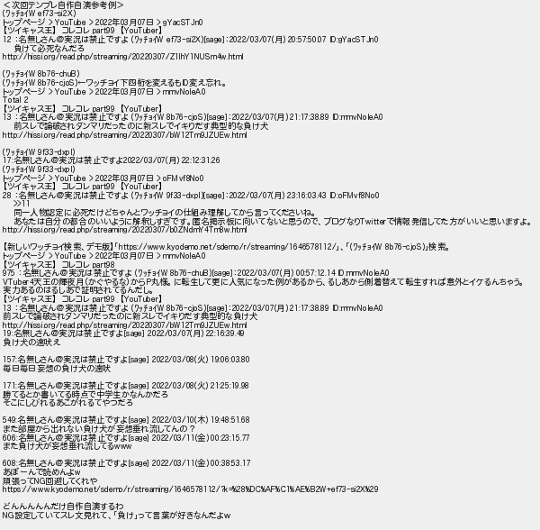 653: (ワッチョイ ef9e-84yK) [] 2022/03/11(金) 11:20:54.95 ID:OaNCEuUx0 <次回テンプレ自作自演参考例> (ワッチョイW ef73-si2X) トップページ > YouTube > 2022年03月07日 > gYacSTJn0 【ツイキャス王】 コレコレ part99 【YouTuber】 12 :名無しさん@実況は禁止ですよ (ワッチョイW ef73-si2X)[sage]:2022/03/07(月) 20:57:50.07 ID:gYacSTJn0 負けて必死なんだろ http://hissi.org/read.php/streaming/20220307/Z1lhY1NUSm4w.html (ワッチョイW 8b76-chuB) (ワッチョイW 8b76-cjoS)←ワッチョイ下四桁を変えるもID変え忘れ。 トップページ > YouTube > 2022年03月07日 > mmvNoIeA0 Total 2 【ツイキャス王】 コレコレ part99 【YouTuber】 13 :名無しさん@実況は禁止ですよ (ワッチョイW 8b76-cjoS)[sage]:2022/03/07(月) 21:17:38.89 ID:mmvNoIeA0 前スレで論破されダンマリだったのに新スレでイキりだす典型的な負け犬 http://hissi.org/read.php/streaming/20220307/bW12Tm9JZUEw.html (ワッチョイW 9f33-dxpI) 17:名無しさん@実況は禁止ですよ2022/03/07(月) 22:12:31.26 (ワッチョイW 9f33-dxpI) トップページ > YouTube > 2022年03月07日 > oFMvf8No0 【ツイキャス王】 コレコレ part99 【YouTuber】 28 :名無しさん@実況は禁止ですよ (ワッチョイW 9f33-dxpI)[sage]:2022/03/07(月) 23:16:03.43 ID:oFMvf8No0 >>11 同一人物認定に必死だけどちゃんとワッチョイの仕組み理解してから言ってくださいね。 あなたは自分の都合のいいように解釈しすぎです。匿名掲示板に向いてないと思うので、ブログなりTwitterで情報発信してた方がいいと思いますよ。 http://hissi.org/read.php/streaming/20220307/b0ZNdmY4Tm8w.html 【新しいワッチョイ検索、デモ版】「https://www.kyodemo.net/sdemo/r/streaming/1646578112/」、「(ワッチョイW 8b76-cjoS)」検索。 トップページ > YouTube > 2022年03月07日 > mmvNoIeA0 【ツイキャス王】 コレコレ part98 975 :名無しさん@実況は禁止ですよ (ワッチョイW 8b76-chuB)[sage]:2022/03/07(月) 00:57:12.14 ID:mmvNoIeA0 VTuber4天王の輝夜月(かぐやるな)からP丸様。に転生して更に人気になった例があるから、るしあから側着替えて転生すれば意外とイケるんちゃう。 実力あるのはるしあで証明されてるんだし。 【ツイキャス王】 コレコレ part99 【YouTuber】 13 :名無しさん@実況は禁止ですよ (ワッチョイW 8b76-cjoS)[sage]:2022/03/07(月) 21:17:38.89 ID:mmvNoIeA0 前スレで論破されダンマリだったのに新スレでイキりだす典型的な負け犬 http://hissi.org/read.php/streaming/20220307/bW12Tm9JZUEw.html 19:名無しさん@実況は禁止ですよ[sage] 2022/03/07(月) 22:16:39.49 負け犬の遠吠え 157:名無しさん@実況は禁止ですよ[sage] 2022/03/08(火) 19:06:03.80 毎日毎日妄想の負け犬の遠吠 171:名無しさん@実況は禁止ですよ[sage] 2022/03/08(火) 21:25:19.98 勝てるとか書いてる時点で中学生かなんかだろ そこにしびれるあこがれるてやつだろ 549:名無しさん@実況は禁止ですよ[sage] 2022/03/10(木) 19:48:51.68 また部屋から出れない負け犬が妄想垂れ流してんの? 606:名無しさん@実況は禁止ですよ[sage] 2022/03/11(金) 00:23:15.77 また負け犬が妄想垂れ流してるwww 608:名無しさん@実況は禁止ですよ[sage] 2022/03/11(金) 00:38:53.17 あぼーんで読めんよw 頑張ってNG回避してくれや https://www.kyodemo.net/sdemo/r/streaming/1646578112/?k=%28%DC%AF%C1%AE%B2W+ef73-si2X%29 どんんんんんだけ自作自演するわ NG設定していてスレ文見れて、「負け」って言葉が好きなんだよw http://egg.5ch.net/test/read.cgi/streaming/1646578112/653